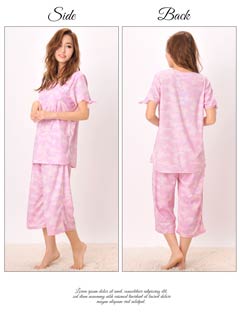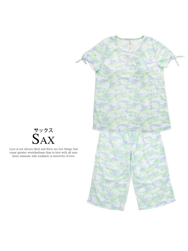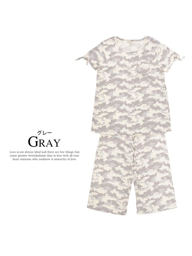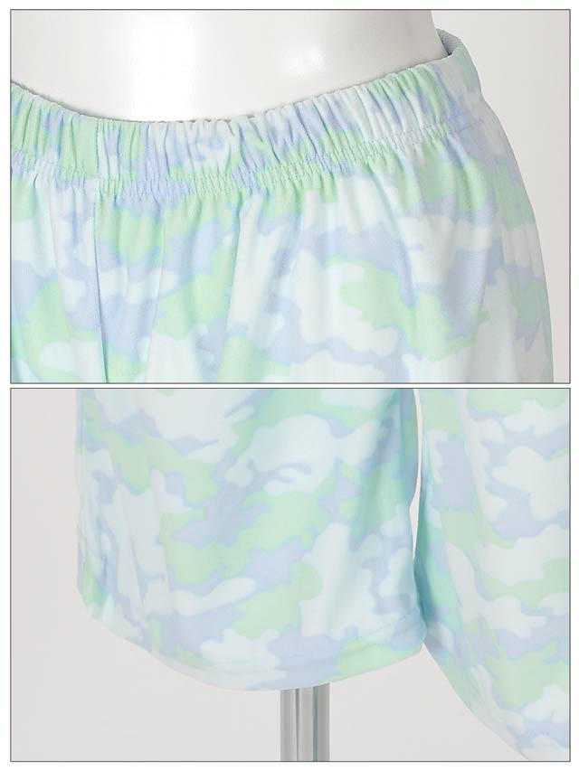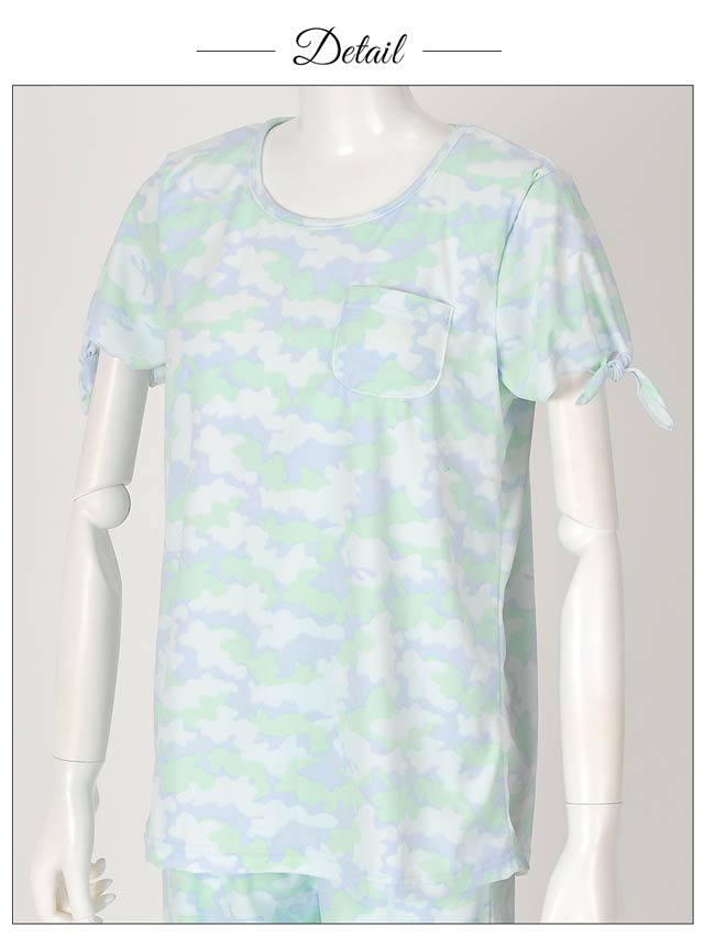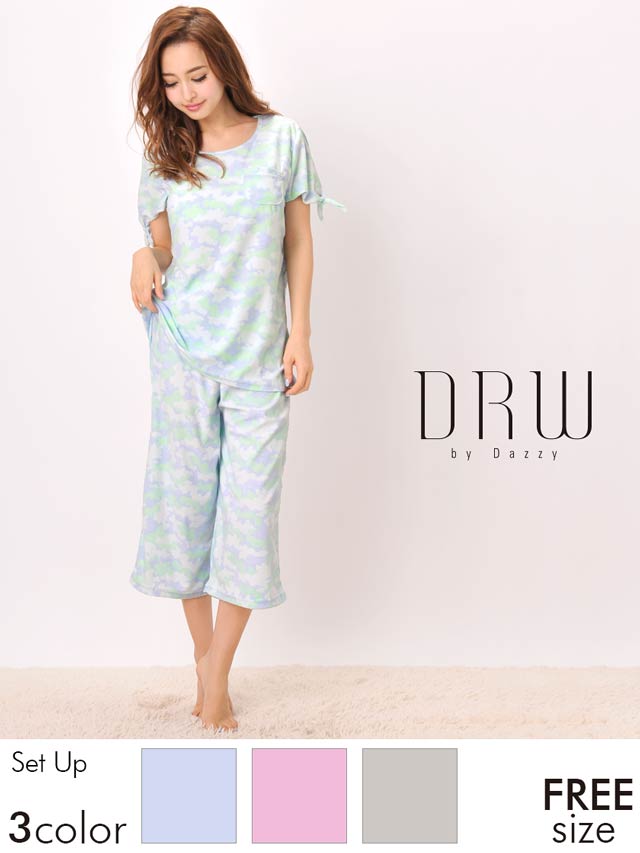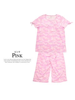 部屋着もオシャレに!淡いパステルカラーの迷彩柄のルームウェア♪トップスには、取り外し可能なカップパッドがついてるので、ブラなしで着れちゃいます!さらっとした素材で仕立ててるので、さわり心地&着心地バツグン◎ヘビロテ間違いなしのCUTEなルームウェアです♪
