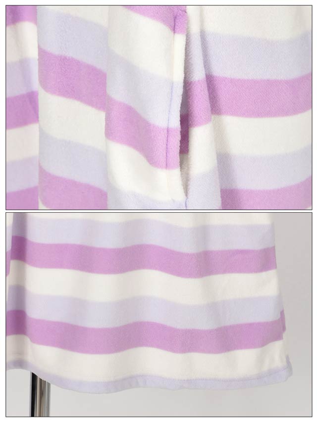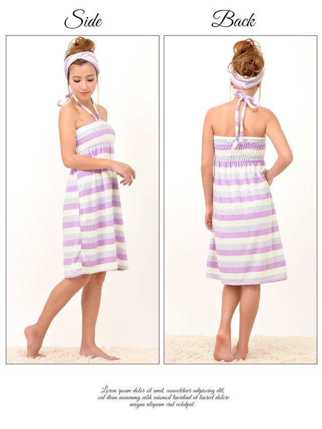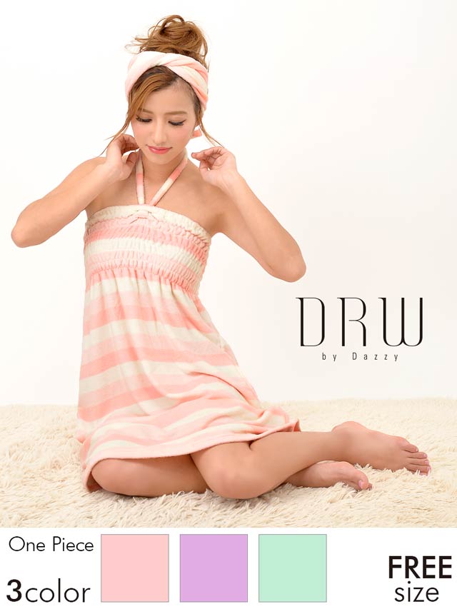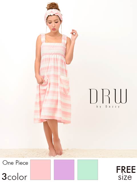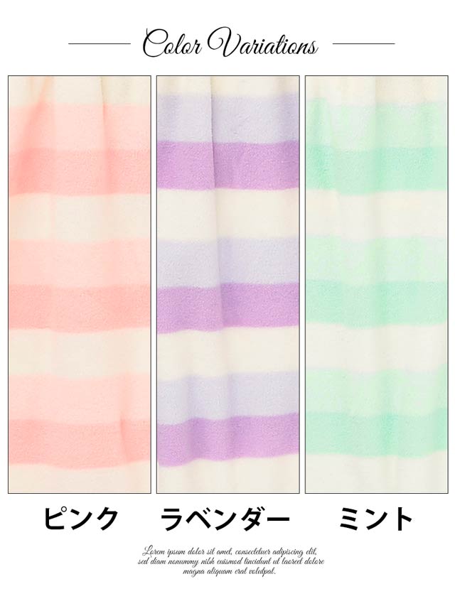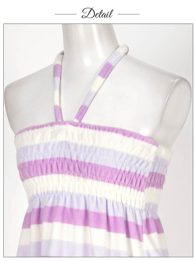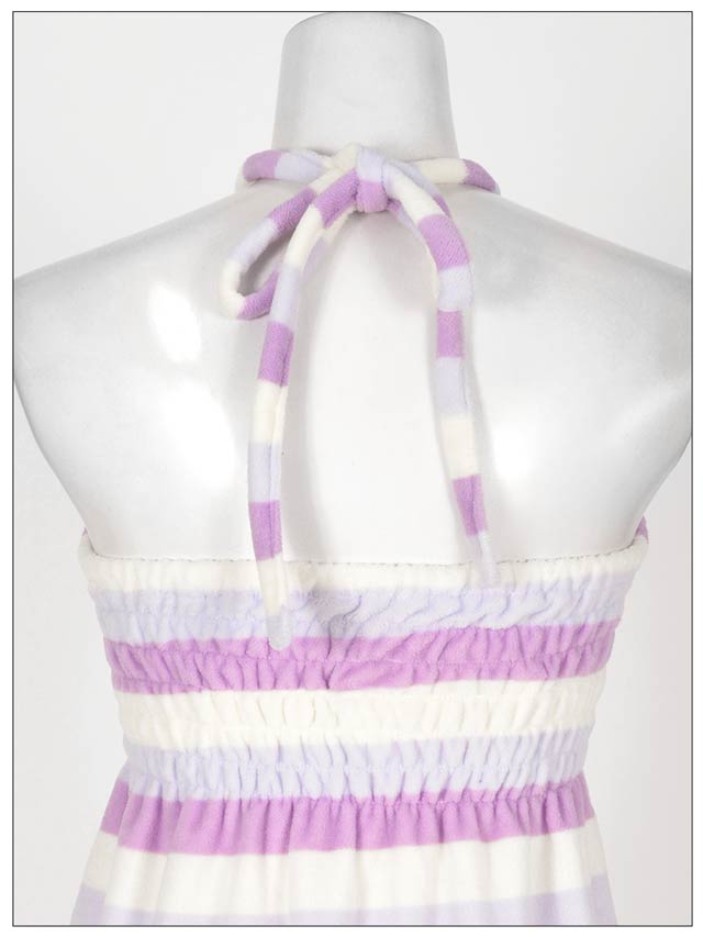 人気パステルボーダーのルームウェアワンピ!さわり心地抜群のパイル生地で仕立てました。ふわふわのタオルに包まれてるかのよう…♪調節可能なホルター紐付で、バスト部にゴムとギャザーがはいってるから、しっかりFit!しかもおそろのヘアバンド付!お部屋でのくつろぎタイムやリゾートや旅行にもぴったりなルームウェアです!