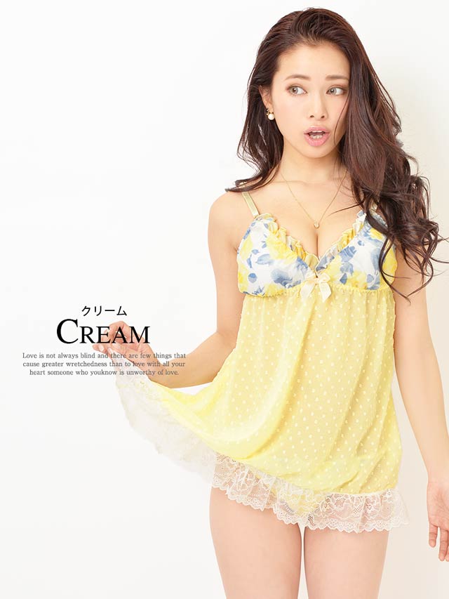 パステルカラー×花柄の、春にぴったりなベビードールです。キャミソールのカップ部は透かしフラワー、切り替え下はキュートなドットをエンボス加工。そして、裾にはFlowerレースを飾って、上から下まで可愛いレディの完成♪ショーツはWラインで、腰周りをスッキリみせてくれますよ!