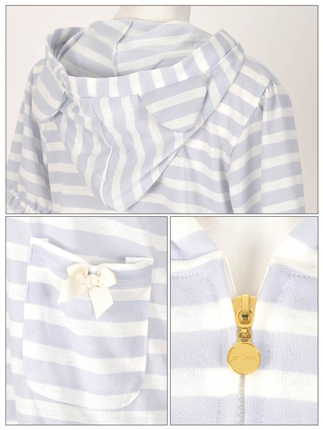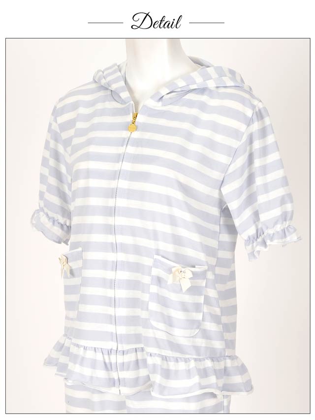 夏にヘビロテ間違いなしの涼しげなセットアップ★生地も薄めでゆるっとしているので着心地抜群!フードは可愛すぎるねこみみ仕様=^・ω・^=裾はフリル仕様でポケットにはリボンも♪甘めのデザインですがボーダー柄でカジュアルダウンさせているので甘くなりすぎずに着ていただけます!カレとのお家デートにもぴったりです!
