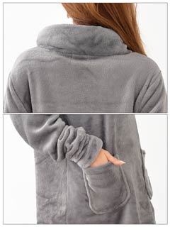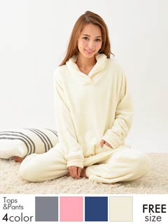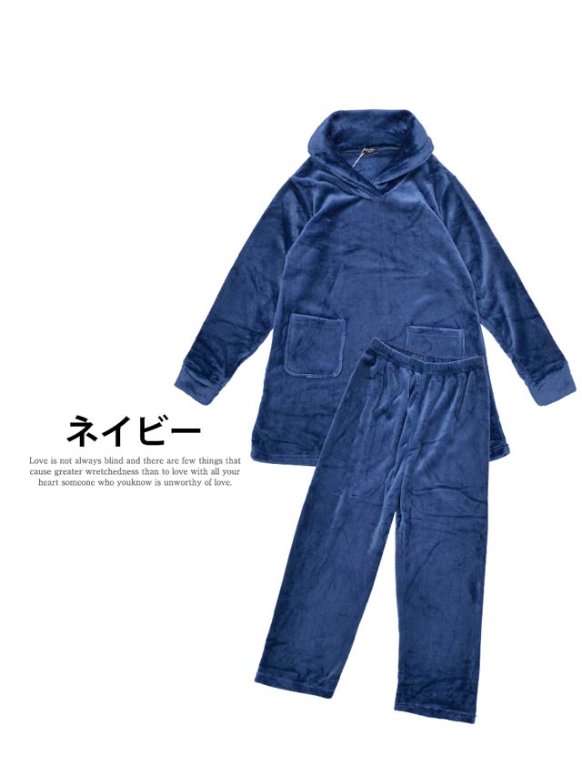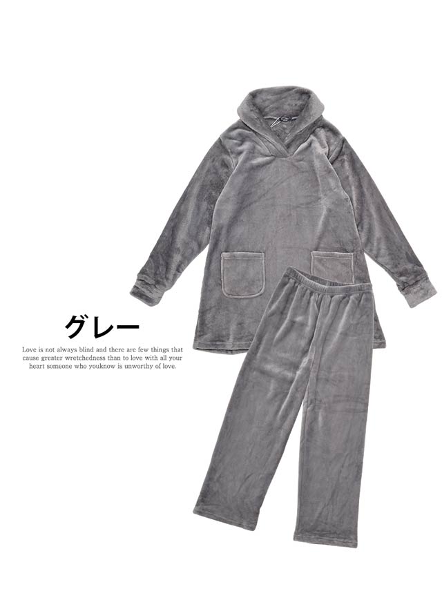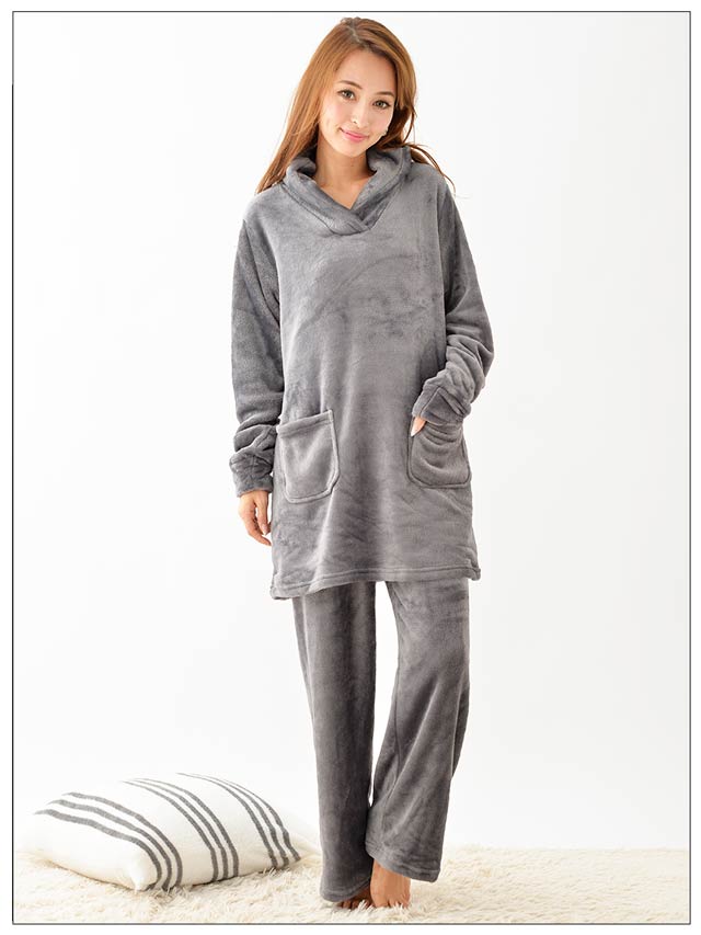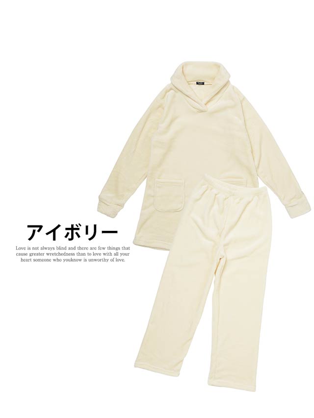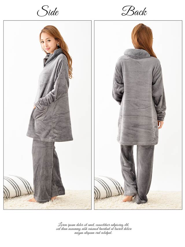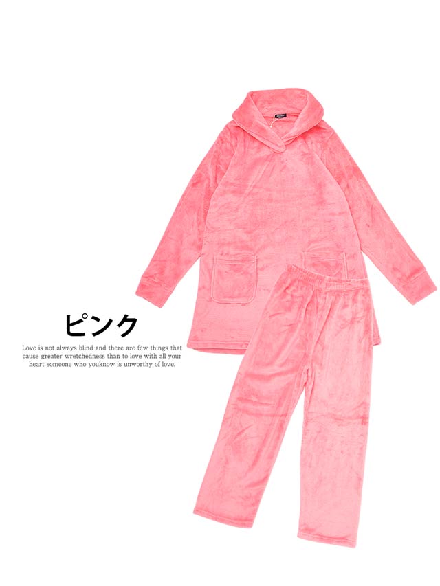 ソフトな触り心地のロング丈ルームウェア!大きめ襟が可愛いロング丈のポケット付きプルオーバー♪ゆるっと着られるロングパンツで足元まで暖かい♪シンプルな無地だからお手持ちのトップスやボトムとも合わせやすい万能デザインです☆