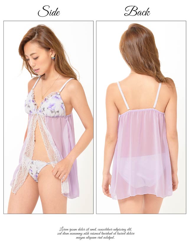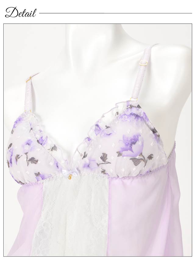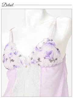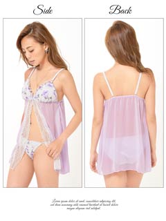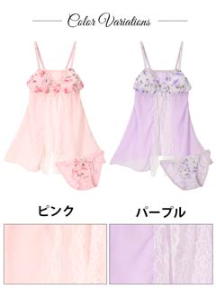 ドットのエンボス加工が施された薔薇柄のロマンティックなシフォンベビードール♪パステルカラーの淡いローズ柄で乙女チックな雰囲気に仕上げました♪前開き部分にはホワイトレースを飾り上品な印象に。ショーツは可愛いイメージとはギャップの色っぽいWライン!!甘さたっぷりの小悪魔ベビードールはお泊まりデートにオススメの1着です♪