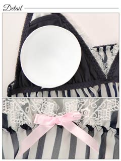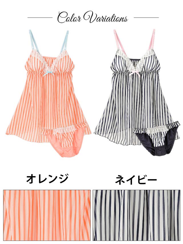 ガーリーで女の子らしいパステルカラーのストライプ柄のベビードール。透け感のあるシフォンにストライプ柄をプリントしました。透けて見えるボディが甘さと色っぽさをひきたてます♪カップ上部には繊細なレースを飾って、女の子らしさもプラス。ブラストラップとリボンは同じカラーでそろえて、ガーリー&フェミニンに♪ショーツはサイドにフリルを飾り、腰元をかわいくカバーしてくれます。おそろいのブラSetとの合わせ買いもオススメですよ!