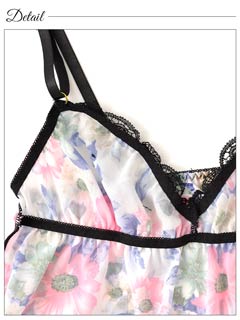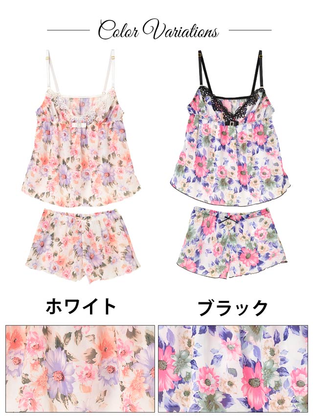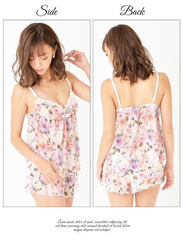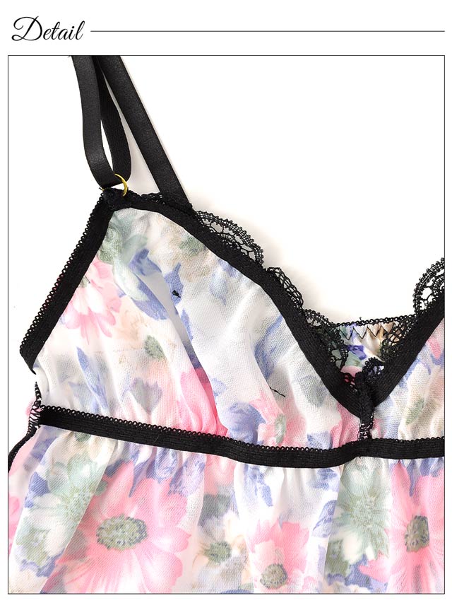 フラワーブーケのように華やかなフェミニンベビードール♪色とりどりの花々を上品なタッチで描いたエレガントデザイン♪胸元には繊細なケミカルレースを飾り高級感を高めます。裾フリルのショートパンツセットだからショーツ姿で過ごすのは恥ずかしいという方にもオススメ!彼とのお泊まりでも大活躍してくれそうな予感♪
