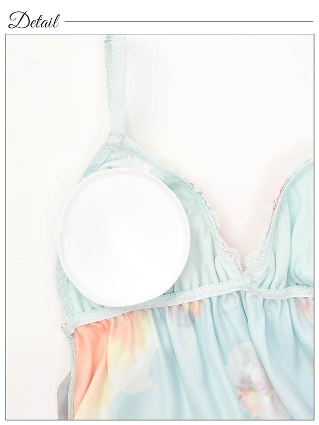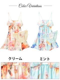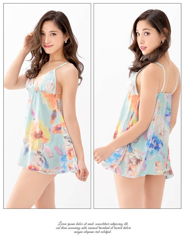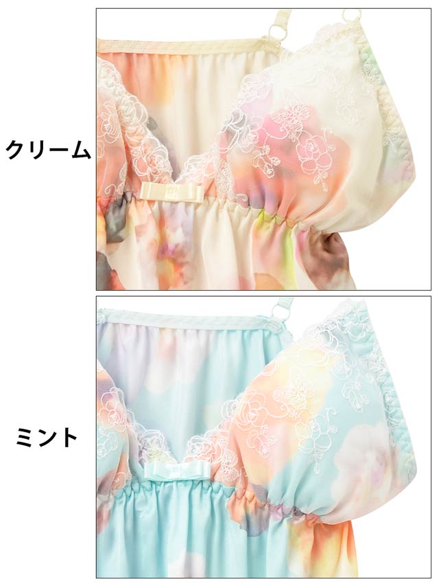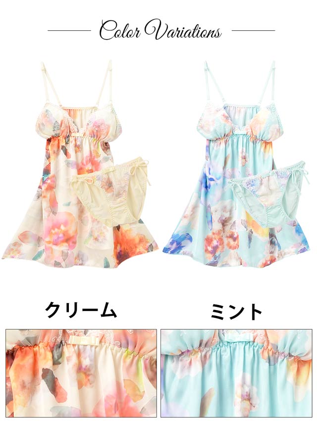 カラフルな水彩フラワー柄のサテンベビードール♪カップの上からROSEやバタフライの刺しゅうをあしらったチュールを被せ上品なデザインに仕上げました。ショーツはほどけるリアルヒモパン♪お揃いのブラSetとの組み合わせもオススメ◎