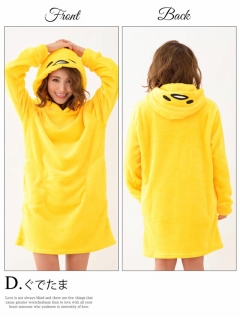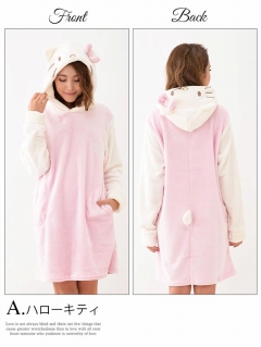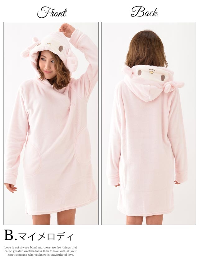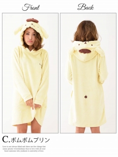 あの人気キャラクターがふわもこのルームウェアになりました♪フードにはそれぞれのキャラクターの顔がついてるので、かぶるだけでなりきり感を味わえちゃう★Aはハローキティ、Bはマイメロディー、CがポムポムプリンでDはぐでたま。バスト部には、さり気ないロゴ刺繍も♪触り心地はもちろんバッチリ◎寒い夜にはヘビロテしたくなるキュート&あったかルームウェアです!