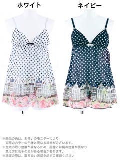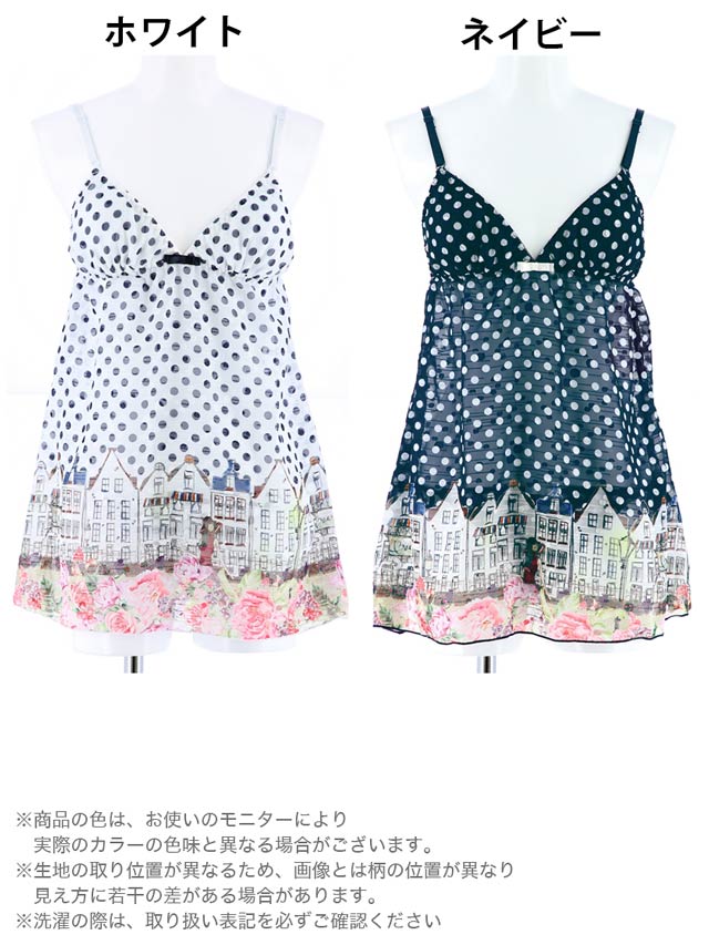 透けシフォンにドット柄とヨーロッパの街並をプリントしたCUTEなベビードール。キャミソールの裾には鮮やかな花が咲き誇り、本当にヨーロッパを旅しているような感覚に…♪付属パッド入りなので1枚でさらっと着れちゃうのも嬉しいポイント!!ショーツはエロカワなほどける紐パン仕様!!カレやお友達との旅行のお供に持っていきたいガーリーなベビードールです☆