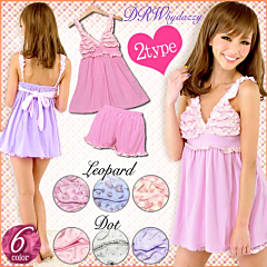 人気のパステルカラーのルームウェア?淡いカラーの柄はDRWで大変人気で完売してしまうほど!!!今回はドットとレオパの2タイプに全カラー6色と言う欲張り可愛いキャミタイプのルームウェアです( ̄▽ ̄*)?フリルたっぷりの大きめな三角型パットでバストをふっくら包み込み、お腹周りはゆったりとしていて着心地抜群↑↑後ろはドキッとするような裸エプロンを想像させるバックリボンデザイン\(●゜∀゜●人●゜∀゜●)/彼も思わず抱きしめたくなっちゃうかも??お部屋のリラックスタイムにお泊り用にオススメなCUTEルームウェアです★