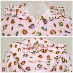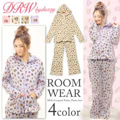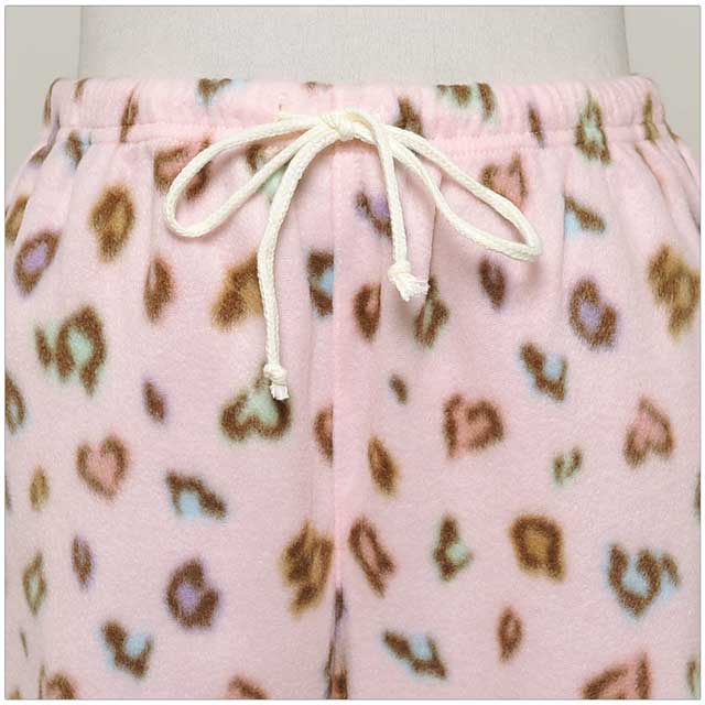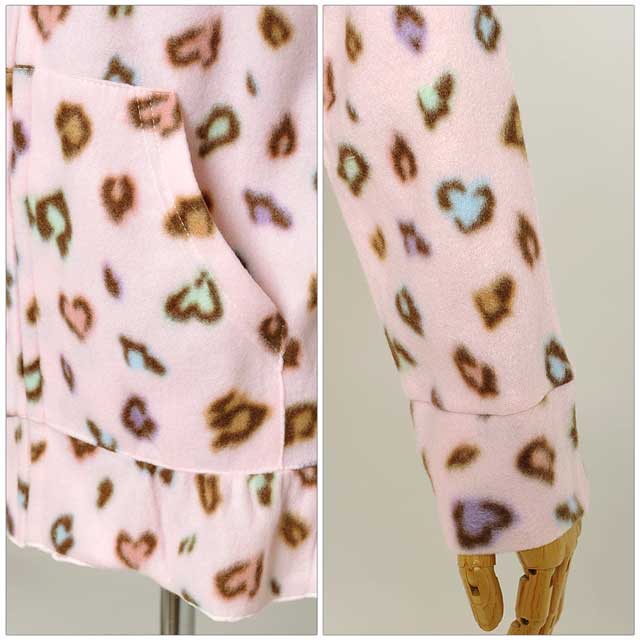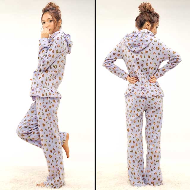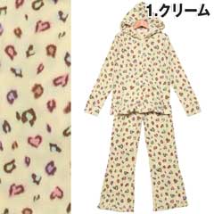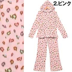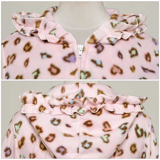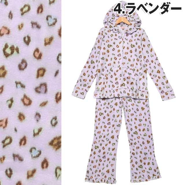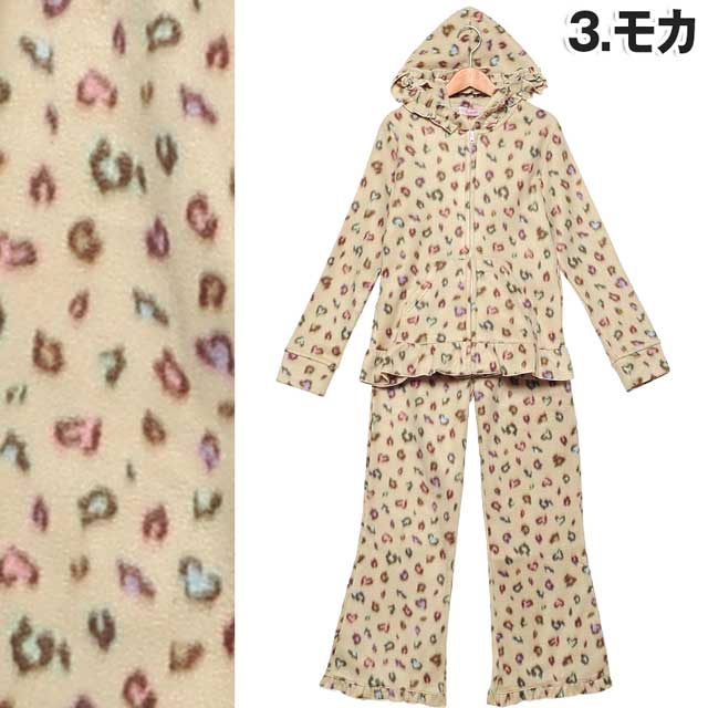 大人気のマルチカラーのレオパ柄セット☆普段はヒョウ柄を着ない…というあなたも、CUTEなカラーだから可愛く着こなせますよ♪よ~く見るとヒョウ柄がハート型になっていて、細部まで乙女心を忘れません!!パーカーとパンツの裾にはフリルをあしらい、さりげない装飾もポイント★☆軽さと温かさを兼ね備えたフリース生地♪この冬のルームウェアはこれで決まり!!