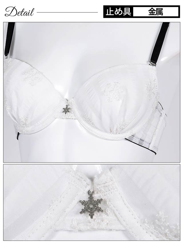透け感のあるシフォンに、雪の結晶の刺繍をデコレーションした、トレンド感満載のブラが登場!幅広い層に支持されるモノトーンカラーはこの冬大活躍の予感…♪バスト中央にも雪の形のチャームを飾りました。ショーツのフロントにはプチリボンをデコレーションして女の子らしさもしっかりアピールできちゃいます。大人可愛いを満喫したいなら絶対このブラ!