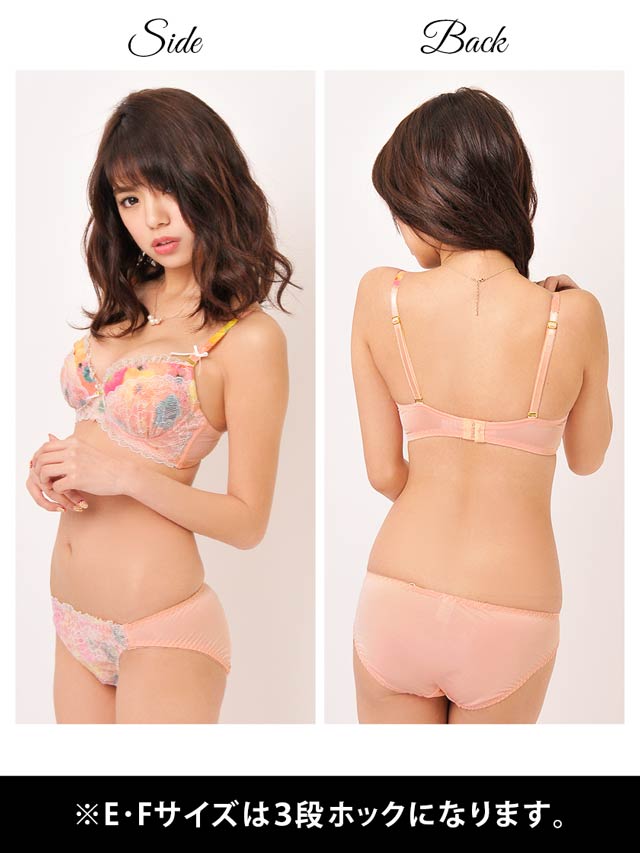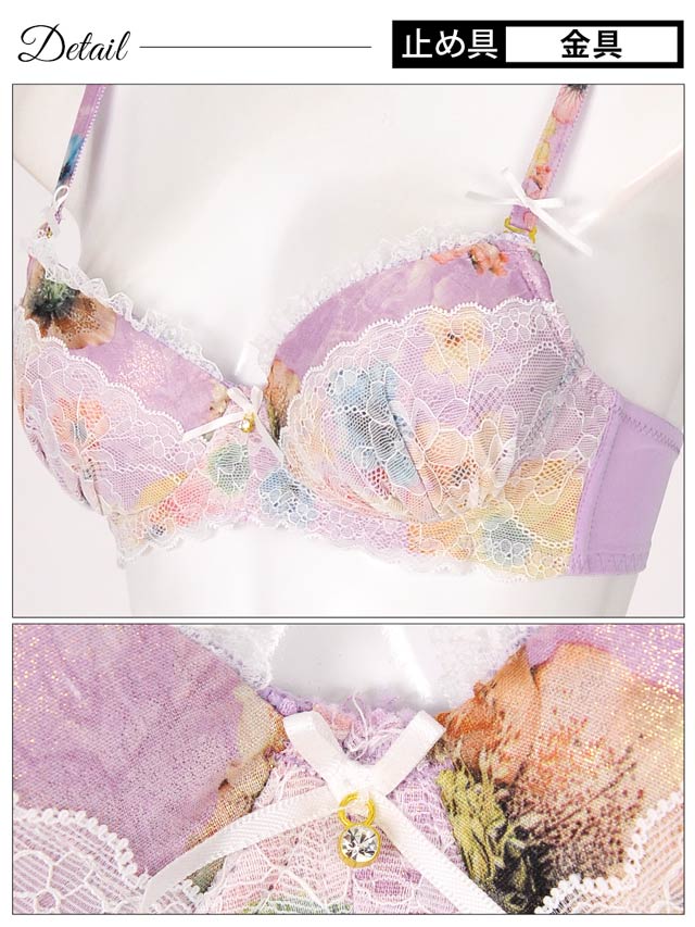 ゴールドラメがキラッと煌くサテンと、カップを覆うコードレースが上品な雰囲気を醸し出します。サテンにはカラフルな花柄を、カップ上部にはギャザー入りのレースをトッピングし、遊び心のあるデザインに♪Wパッド構造で、盛り胸makeもバッチリ☆☆エロさも可愛さも兼ね備えているこのブラはどんなシチュエーションでも大活躍すること間違いなし!