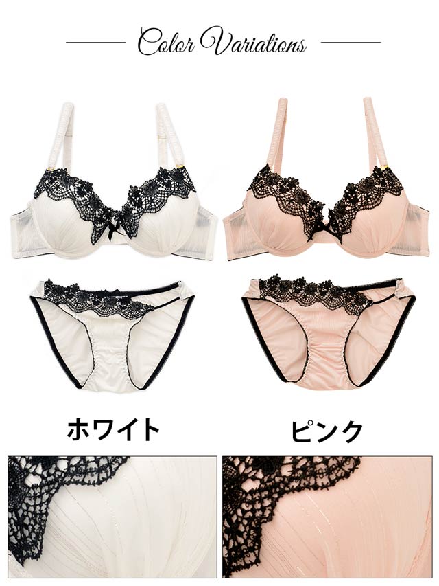 シンプルなシフォンに豪華なケミカルレースが映える、大人っぽいデザイン。谷間部分にあしらわれているので、谷間をよりキレイに魅せてくれる効果もあります!カップにはシルバーラメでストライプ柄が描かれていて、さりげなくキラッと輝くのがポイント★ショーツは左右非対称デザインのアシメショーツ!オシャレなうえに超SEXYに決められちゃう優秀なランジェリーです!