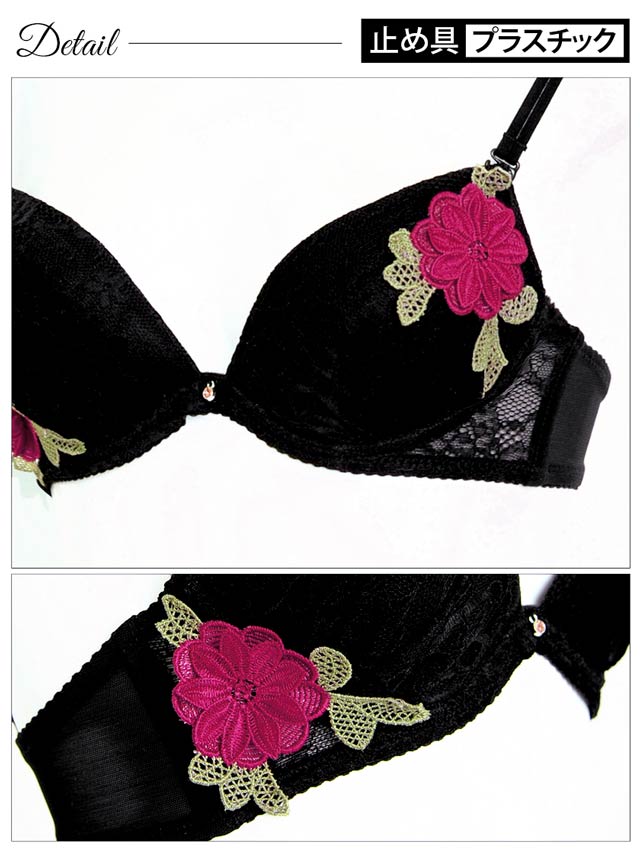 シンプルで挑戦しやすいモノトーンレースに一際目立つ「真紅ローズ」のモチーフを装飾した夜遊びブラセットッ!胸元中央にはキラリと光るラインストーンで貴女の谷間が華やかに仕上げます。ショーツのサイドは、細めのストリングで、腰周りもスッキリえろボディーに!セクシーの王道でもあるデザインなので、ここぞ!って時に活躍してくれますよ!