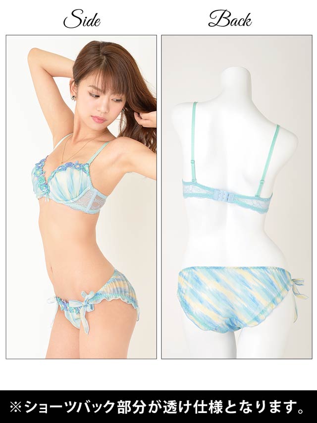 まるで花畑を映したような、flower刺繍と水彩グラデーションカラーのブラセット。3色の刺繍糸で紡がれた刺繍は、清楚なレディにぴったりのあしらい。カップ部分はふんわりとしたシフォンで仕立てられ、細やかなラメストライプが高級感を加速させます。ショーツは『ほどける紐パン』で、カレの心をがっちりキャッチ!バックも透けシフォンになっているので、上品な透け&エロが楽しめます。