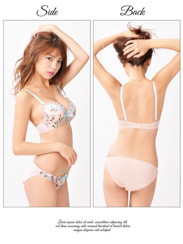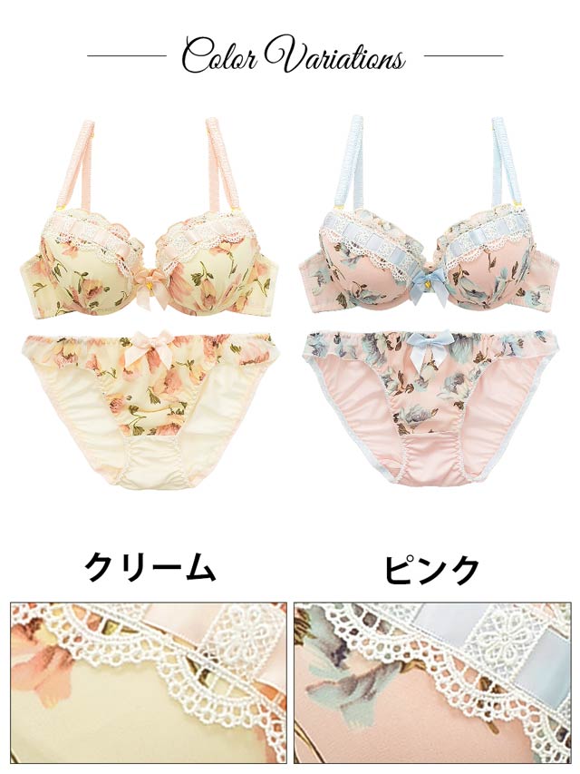 淡色シフォンにヴィンテージローズを描いたエレガントなブラ♪女性らしい優しい色合いでまとめられた花柄♪谷間部分にはサテンリボンを飾った刺繍レースをあしらい上品なデザインに仕上げました。ショーツサイドはフリルラインで飾り可愛く華奢見せ♪女性の魅力を高める愛されブラです☆