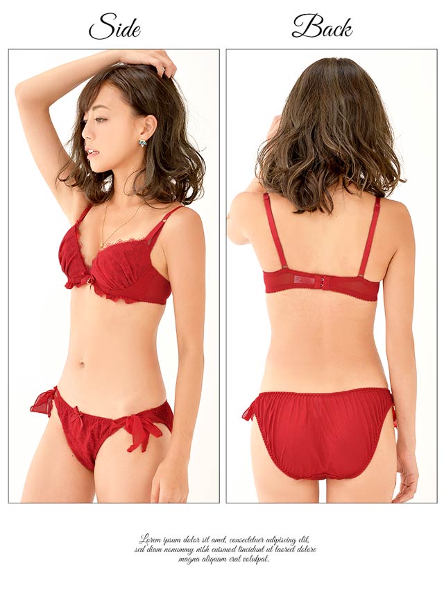 シフォンと同色のROSE柄フロッキー加工がオトナっぽいブラセット★三角部分を調節することでバストとカップをギュッと近づけ寄せ上げるトライアングルストラップ採用♪盛り効果もバッチリ◎フルバックにはほどけそうでほどけない、フェイクリボンを飾って上品なSEXYさを演出してくれます。大人の色気たっぷりのランジェリーはデートにもオススメの1着です♪