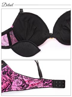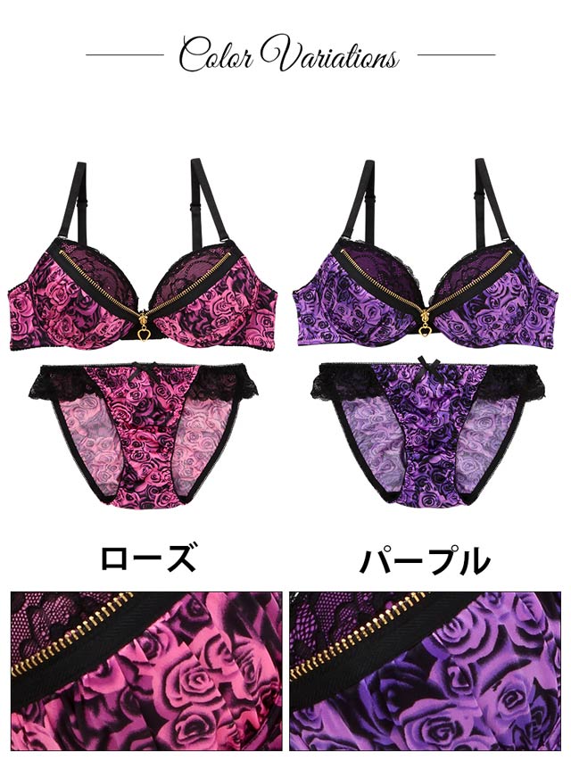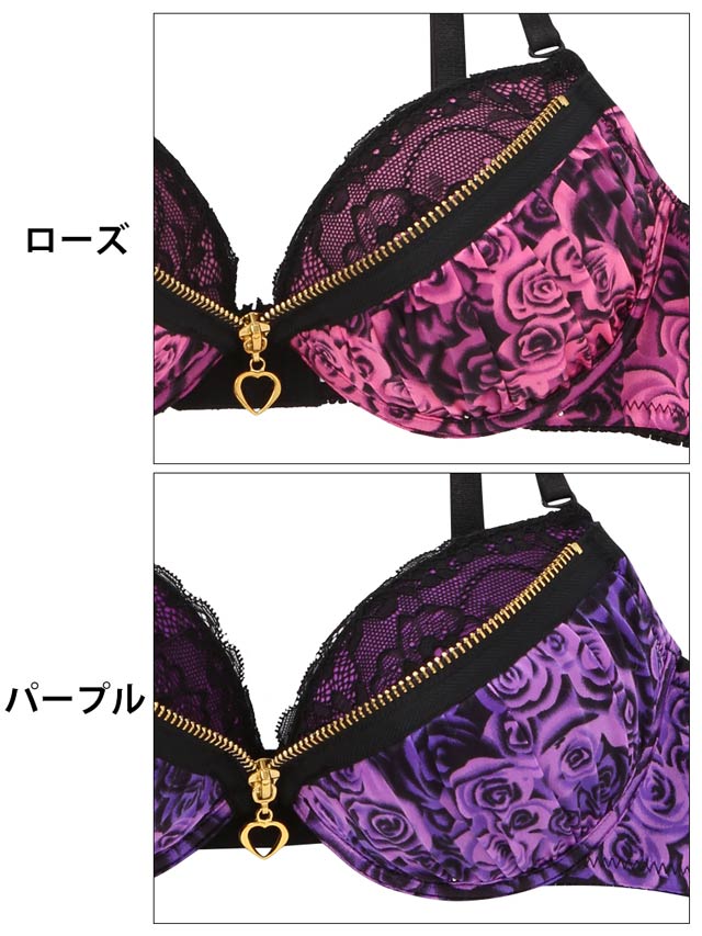 妖艶なブラックローズの盛れる『ファスナーブラ』! ビビッドカラーの薔薇柄にブラックで陰影をつけたエロティックなデザイン★フロントのファスナーを調整して自由自在に谷間が作れます♪ファスナー部がカップの上になっているので、肌に直接ファスナーが当たらず「バストを傷つけない」&「ひやっとしない」嬉しい新設計♪妖しい色気漂う薔薇柄ファスナーブラは勝負の日にオススメの1着です!!