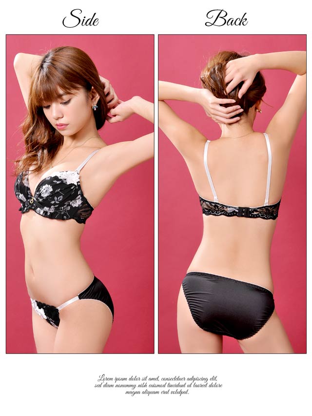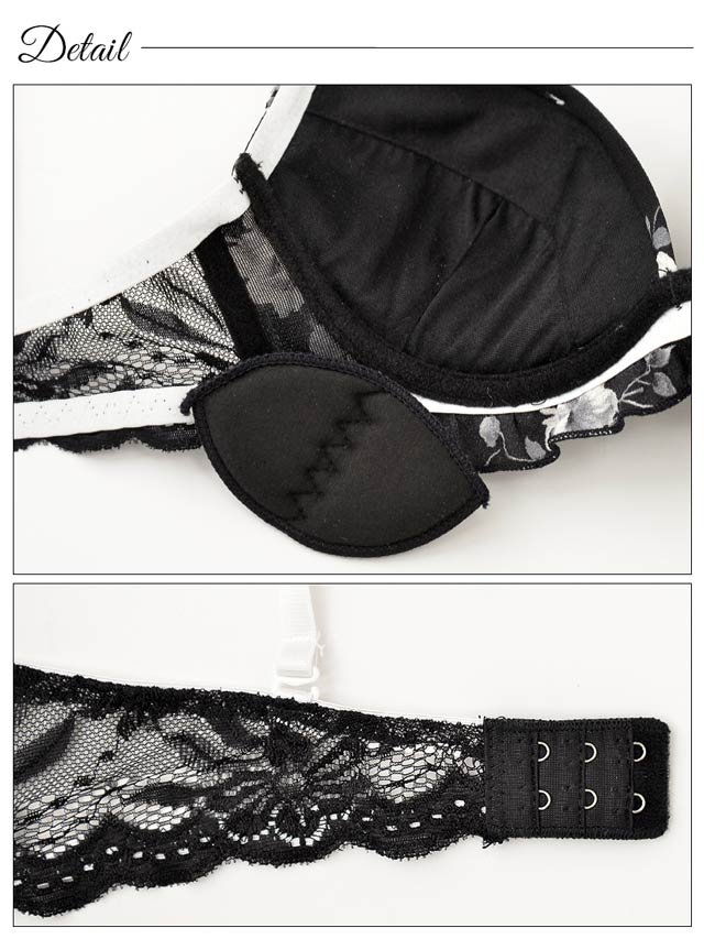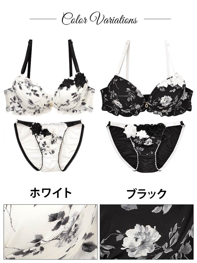 シックなモノトーンカラーの花柄ランジェリー。ギャザーがかったシフォンは、バストをまんまるに魅せてくれる効果アリ!バスト、ショーツのそれぞれのサイドに飾られたバラのケミカル刺繍が、なんとも言えない色っぽさをそえてくれます♪アンダーには華奢なフリル、中央には涙型のラインストーンチャームを飾って、女の子らしさをアップ★甘すぎない、ほどよい可愛らしさを演出してくれるCUTEなランジェリーです。