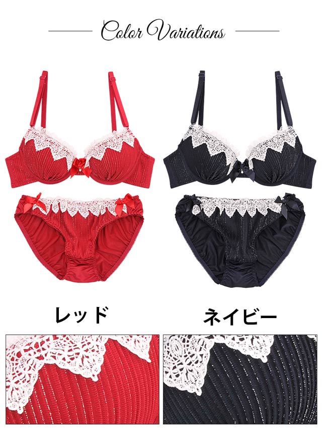 ラメ入りの立体プリーツニットに刺繍レースを飾ったキュートなデザイン!これからの季節にピッタリのディープカラー♪キラキラと輝く立体プリーツニットに心躍る華やかデザイン★谷間部分の刺繍レースが高級感をプラスし上品な仕上がりに♪ショーツサイドに飾られたリボンでよりキュートに演出できちゃいます★クリスマスシーズンにピッタリの華やかランジェはデートにもオススメの1着です♪