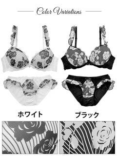 ストライプにローズシルエットを描いた大人のモノトーンブラ。柔らかなシアーシフォンに上品なレースを飾り高級感を高めます。ピンストライプにローズシルエットを描き、大人の女性に似合うシックな花柄に仕上げました♪フルバックはフロントサイドが透けレースになっている色っぽいデザイン!フリルラインでちょっぴり甘さもプラスしました♪