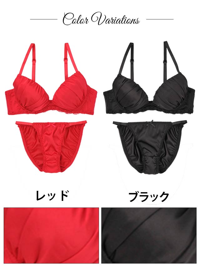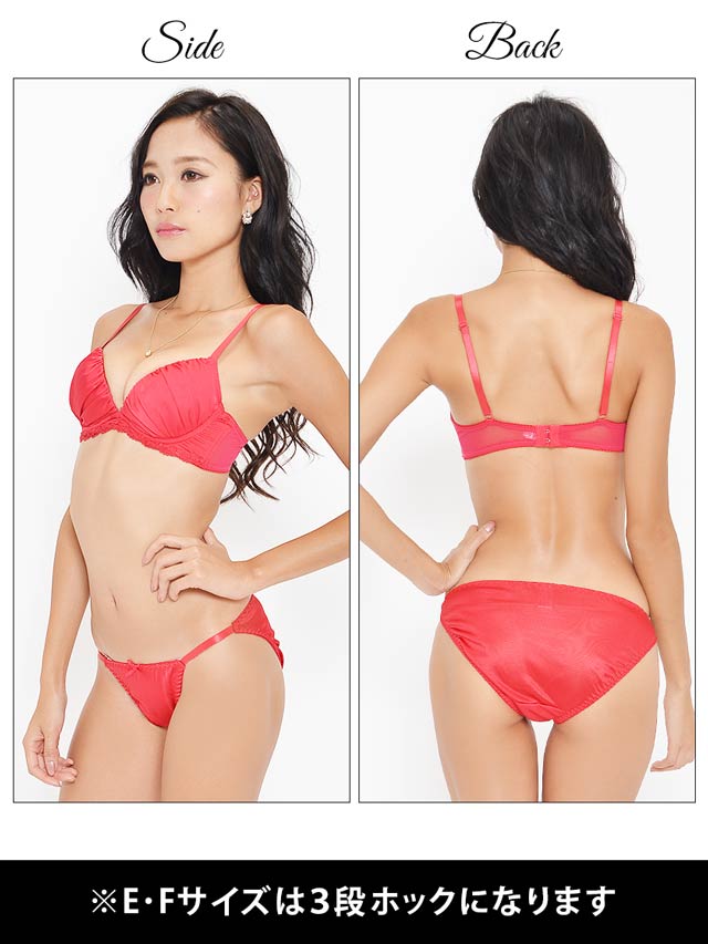 ツヤ感のあるサテンで仕立てた、シンプルでエレガントなブラセット。カップはギャザーサテンをあしらい、バストをまんまるに魅せてくれます。アンダーには可愛らしいケミカルレースを飾って、女の子らしさもさりげなくアピール☆ショーツは、フロントに可愛らしいプチリボン、サイドは細いストリングを飾って腰元をスッキリ&色っぽく。ヘビロテしたくなる、SEXYなランジェリーです♪