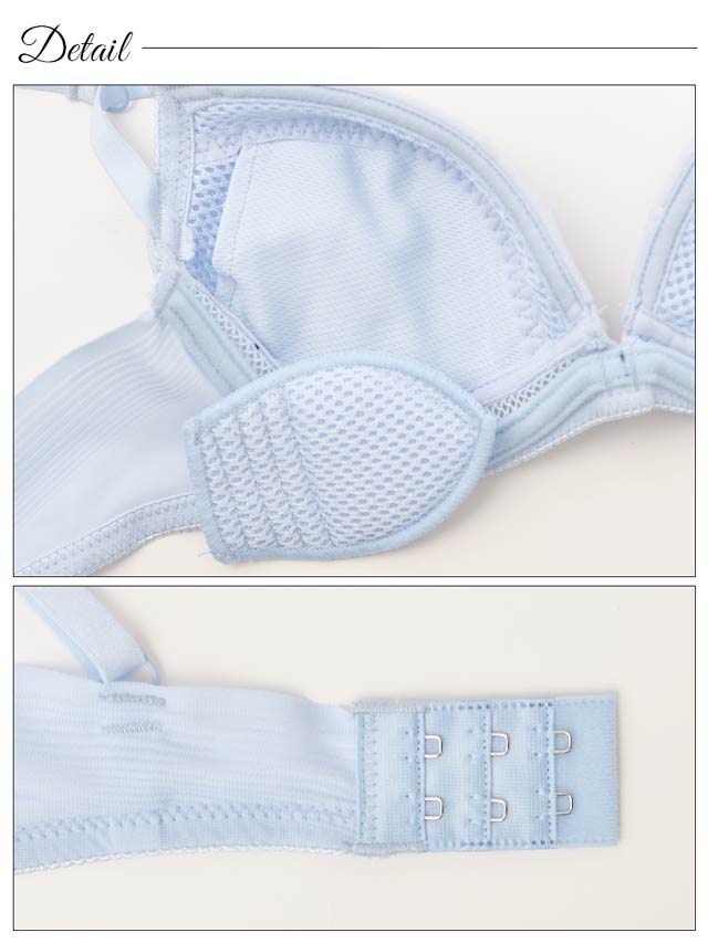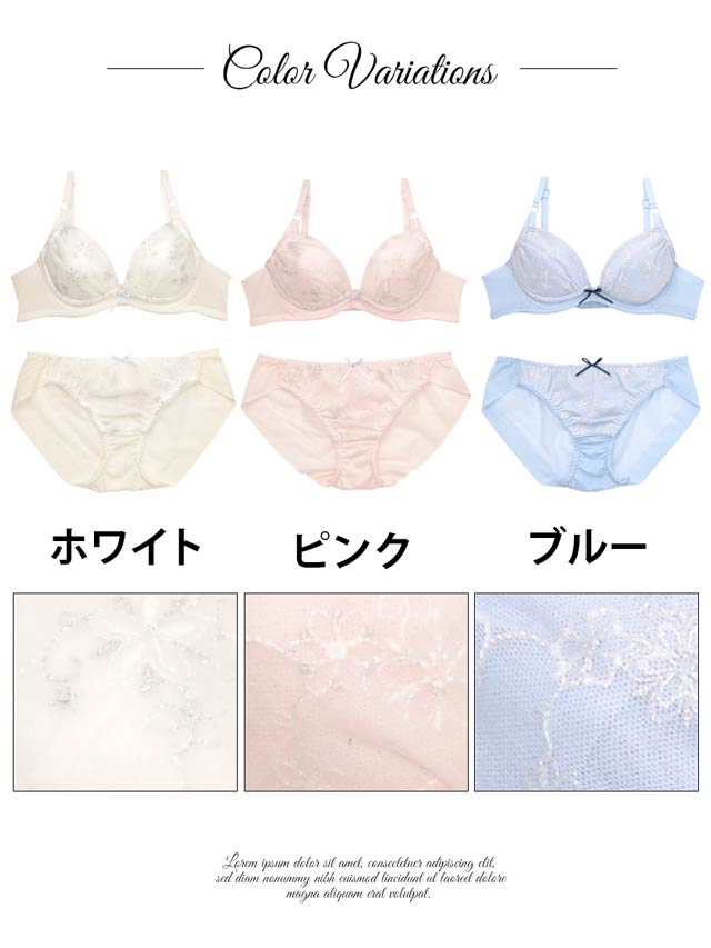 着心地さらりと蒸れにくい通気性抜群の機能性◎刺繍ブラセット♪裏地とパッドがメッシュ素材になっているので、暑い日でも汗で蒸れずにさらさら感をキープしてくれます☆ブラベルト上部とパンツの後ろ裾はアウターに響きにくいヘム仕様♪あつーい季節のお助けアイテム!もちろんデザインにも凝ってます!!キラキラと輝くラメ入りフラワー刺繍が可愛いガーリーデザイン♪こんなに贅沢なランジェリーが今だけプチプラ1270円で買えるチャンスです!