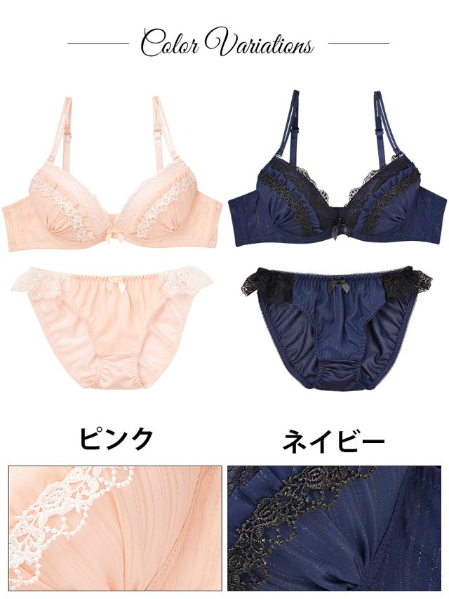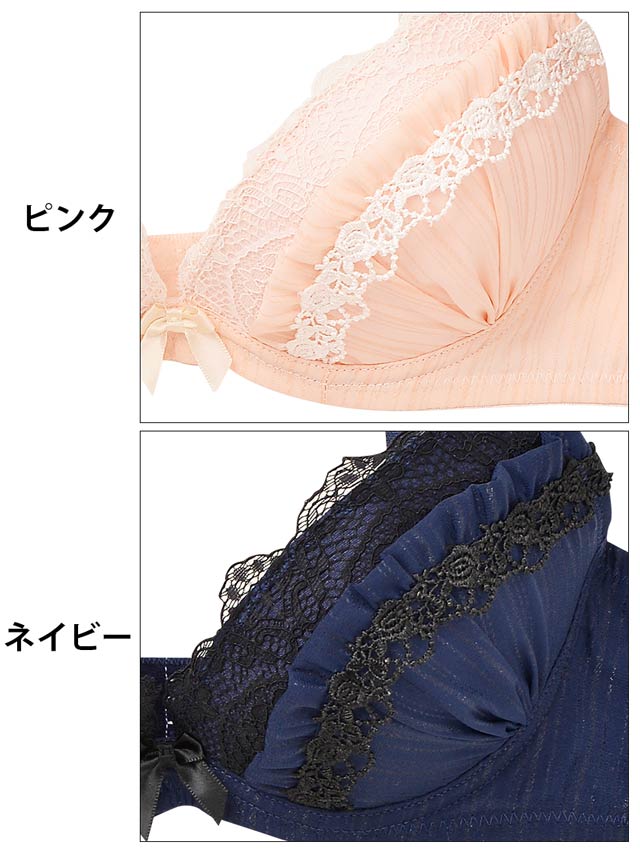 ラメストライプのふんわりシフォンにケミカルレースを飾ったフェミニンなブラ♪繊細なコードレースにラメ入りシフォンをレイヤード。シフォンにギャザーを寄せて胸元にふんわりボリュームをプラスしました☆フルバックのサイドはレースのフリルラインで飾られ、女性らしい腰元を演出♪レースたっぷりの上品なフェミニンブラは甘すぎず大人の女性にオススメの1着です♪