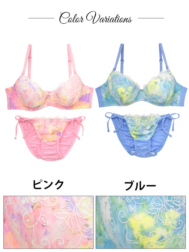フローラルな香りが漂うようなカラフル水彩Flower柄にROSE刺繍描いたランジェリー♪淡いウォーターフラワーがカップいっぱいに咲き誇る豪華なデザイン!!フルバックのサイドはカレ受けNo.1のほどける紐パン仕様☆高級感のあるデザインなのに、プチプラだからとってもお買い得☆華やかさで女性の魅力を増す、エロかわ度抜群の水彩柄ランジェリーはこの夏ヘビロテ間違いなしの1着です♪
