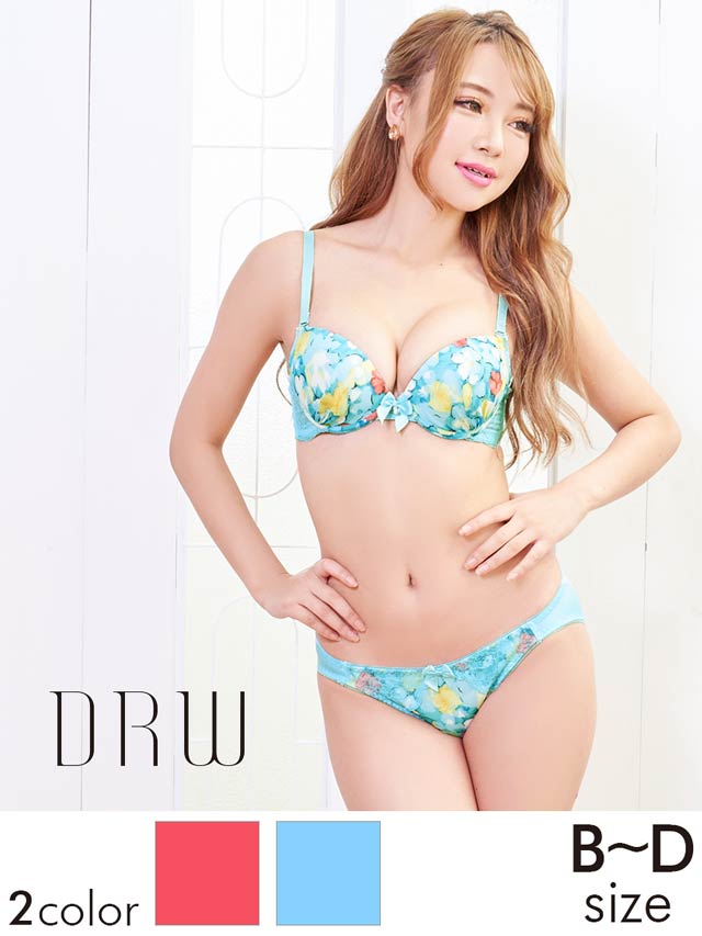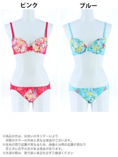 カラフルな手描き風のフラワー柄が華やかなフェミニンランジェリー♪手描き風のフラワーがカップいっぱいに咲き誇る心華やぐデザイン☆パッドは厚めの内蔵パッドと、取り外しのできる立体型パッドのWパッドで、しっかりとボリュームUPできちゃいます!谷間部分にはプチリボンとキラリと光るラインストーンチャームをトッピング♪甘めのガーリーな花柄ブラはカレとのデートにもオススメの1着です!