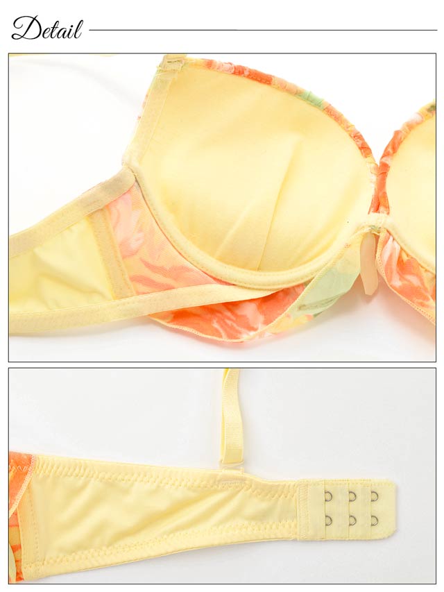 ふんわりとしたシフォンに、華やかなROSEをプリントしたブラセット。南国を思わせるROSEプリントが夏らしく、身に付けることでボディを華やかに演出してくれます。ブラのアンダー飾ったフリルは、バストを綺麗魅せ効果&女の子らしさを加速させてくれます♪ブラはバストを下から持ち上げてくれる厚めの内蔵パッドで、盛り胸メイクもカンペキ!腰に食い込むショーツラインは色気を倍増し、彼を誘う腰元に♪テンションをアゲたい日にはこのランジェリーがぴったり☆