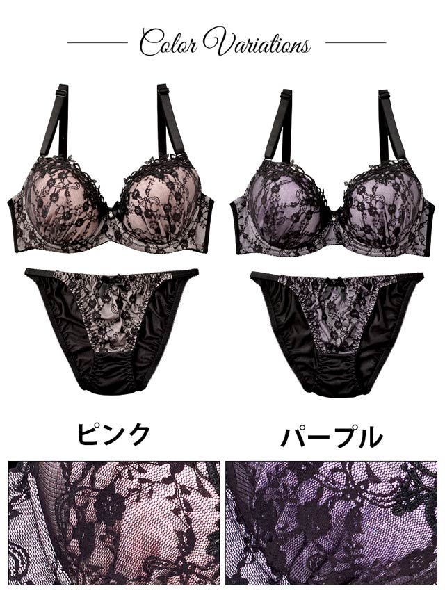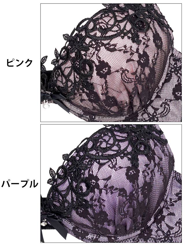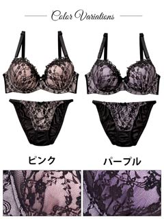 パステルカラーのベースにBLACKレースをレイヤードしたSexyランジェリー♪パステルカラーに映える花柄のブラックレースは女性らしい色気を放つ大人可愛いデザイン!谷間部分にはケミカルレースをトッピングしてゴージャスに飾り付けます!!カラバリは甘エロなピンクと、ミステリアスな雰囲気を醸し出すパープルの2色展開★ストラップは通常サイズよりも太めの15mm幅なので、グラマーさんでも安定して支えてくれます!フルバックのサイドは細いストリング仕様なので、気になる腰周りをスッキリ見せる効果もプラス!!見るだけでクラクラしてしまいそうなほどフェロモン全開のSexyランジェは特別な夜にオススメの1着です!!