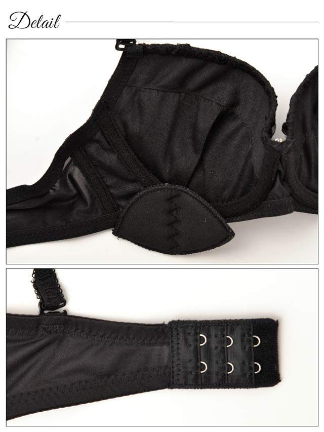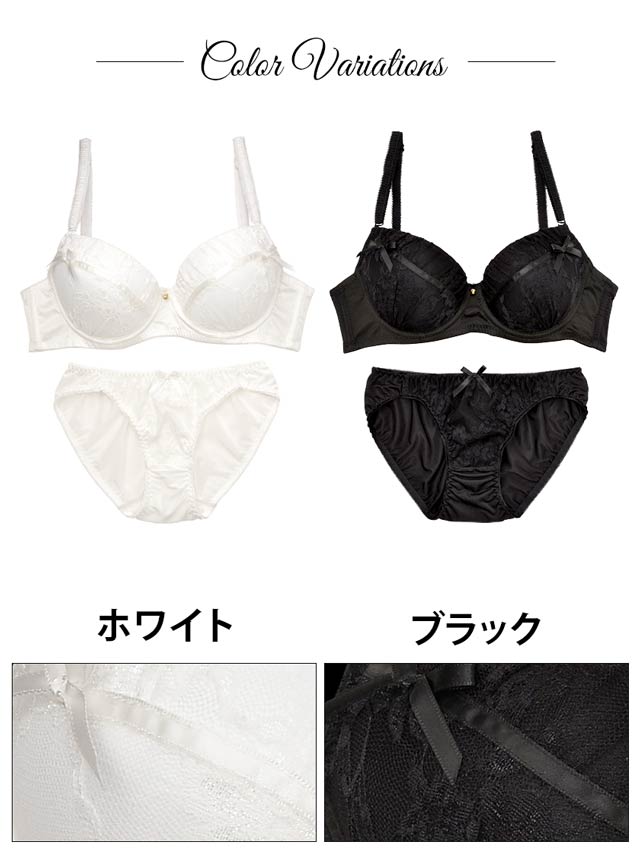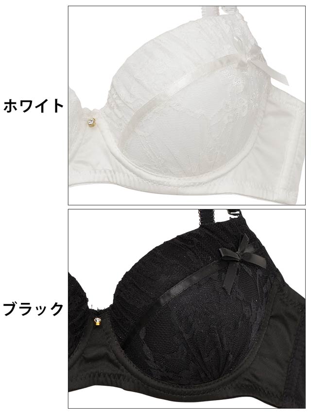 シンプルなフラワーレースにサテンリボンをトッピングしたエレガントなランジェリー。フロントに飾られたラインストーンチャームがアクセントに♪厚手の内蔵パッドと立体パッドのWパッドで下からしっかり胸を盛り上げます!季節を選ばないシンプルなモノトーンカラーは何着か持っておくと便利なアイテムです♪
