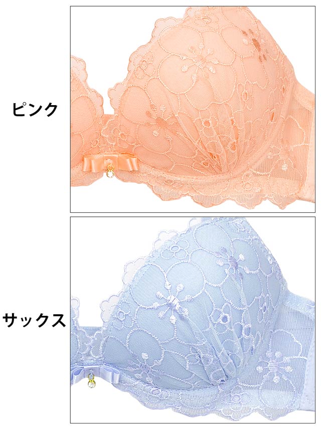 カップいっぱいに咲き誇る大輪フラワーがキュートな刺繍ブラ☆透け感がほんのり色っぽいチュールレースにフラワーモチーフを縁取り刺繍で描きました♪フロントにはWサテンリボンとラインストーンチャームを飾りRich感をプラス☆ワンカラーでも華やかな印象の贅沢刺繍ブラはお得感◎お値段以上の高見えデザインです♪