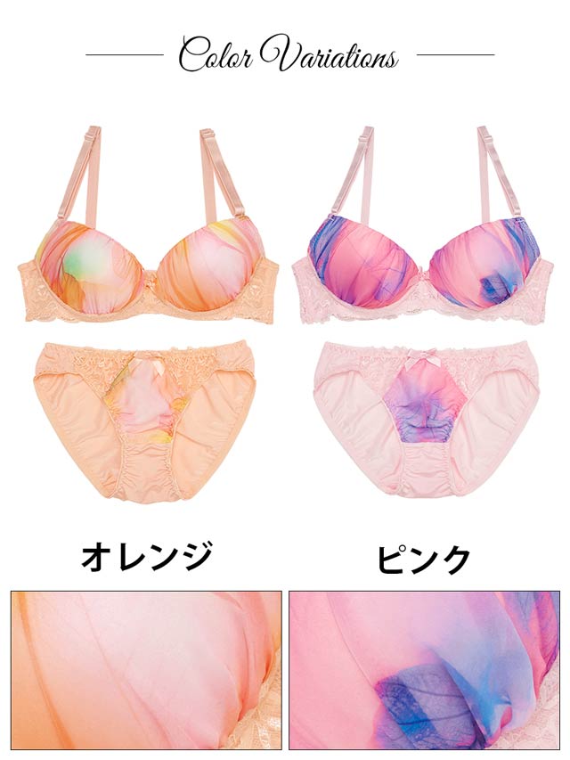 シフォンに淡いパステルのボタニカルグラデーションを描いた爽やかなランジェリー♪パステルカラーの溶け合うグラデーションが神秘的なデザイン!!たっぷりとギャザーを寄せたシフォンカップはさり気なく胸元にボリュームを与えてくれる優れもの★*ストラップは通常サイズよりも太めなので、グラマーさんでも安定して胸を支えてくれます!ショーツのフロントサイドは透けレースになっていて、少し背伸びをしたい方にオススメのSexyデザイン♪可愛さもエロさも兼ね備えた甘エロランジェリーでカレの心をわしづかみ☆