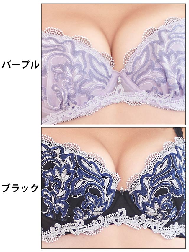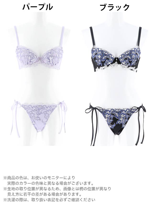 ボタニカルモチーフを2色の刺繍糸で描いたランジェリー♪立体感のあるリーフ刺繍がとってもゴージャスな雰囲気に。ブラのアンダーと谷間部分にはケミカルレースをあしらい、バストを美しく演出します。フルバックのサイドは、カレが興奮すること間違い無しの大人気ほどける紐パン仕様です☆