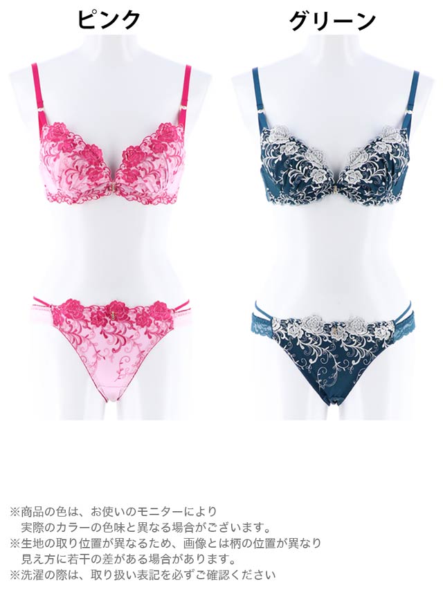 ラメ糸を織り交ぜたローズ刺繍ランジェリー。豪華なローズ刺繍と曲線を描いたボタニカルモチーフで、優美さと色っぽさをアピールできちゃう♪ストラップは脇に逃げたお肉も三角部分を調節するだけで簡単にカップの中にしっかりインできちゃう人気の「トライアングルストラップ」仕様♪ショーツは透け感がたまらないと話題のバック透けショーツにレイヤード風のWラインで、腰元の色っぽさもしっかりアピールできちゃうデザインです☆