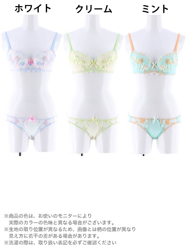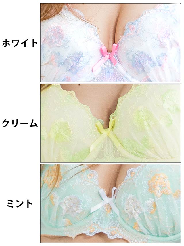 カラフルなポピーフラワー刺繍が華やかなブラセット♪2色使いで贅沢に描かれたポピーフラワーがお値段以上の高級感!ブラジャーとショーツのフロント部分にはリボンを添えてアクセントに☆ショーツは両サイドが透けたフロント透けデザイン!!ちょっぴりセクシーなデティールに思わずカレもドキッとしてしまうカモ!?EFサイズまで同一価格なのでグラマーさんにもオススメの1着です☆