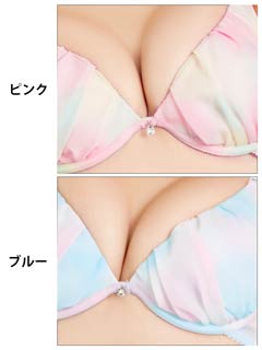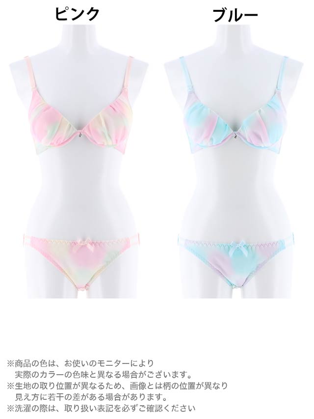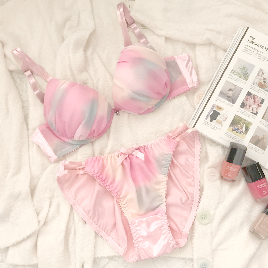 コットンキャンディみたいな甘かわランジェリー♪パステルのグラデーションに思わずうっとり…ふんわりとしたシフォンを重ねることによって、立体感のあるギャザーをつくり、バストにボリュームを与えてくれます。ブラストラップのフロント部は、ダブルになっているレアなデザイン♪フルバックのサイドは細い2本ストリングで、気になる腰周りをスッキリ見せ!!大好きなカレに甘えたいときにピッタリのランジェリーです☆
