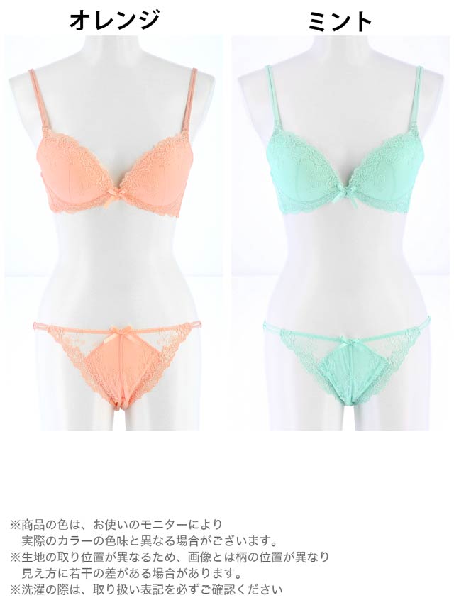 可愛いも上品もアピールできちゃうパステルのブラセット。肌によく映える明るいパステルカラーのランジェリーは、どんなシーンでも大活躍の予感・・・♪ブラ上部には、さりげなくバラ刺繍を施し、ブラベルトは透けレースを使いました。ショーツは、大事なところまで見えてしまいそうな透け透けなエロショーツ!フロントもバックも透けレースを使った、大胆なデザインは「ここぞ!」という勝負の夜にもオススメ◎