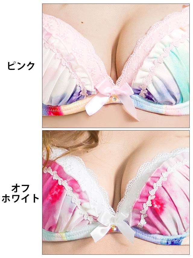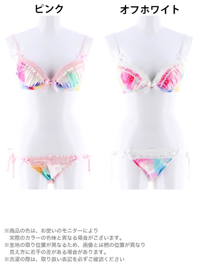 フェミニンな雰囲気漂う水彩ランジェリー♪たっぷりとギャザーを寄せたカップに小花ケミカルレースを施した甘くキュートなデザイン♪ショーツはフロント部分が透けていてちょっぴりセクシー!!サイドはほどける紐タイプでカレ受けも抜群です☆カラフルな水彩柄ランジェを身につければ、気分も上がっちゃうハズ!!