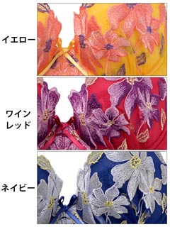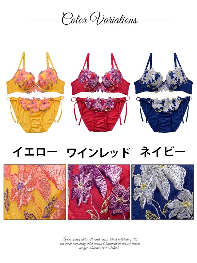 カップ一面に贅沢な大輪Flower刺繍を施した紐パン付ランジェリー♪細部まで繊細に描かれたフラワー刺繍はまるでインポートランジェリーのようなRich感!!カラバリは大人の色気香るワインレッドと、シックな雰囲気漂うネイビー、明るくジューシーなイエローの3色展開です!!フルバックのサイドはカレ受けNo.1のほどける紐パン仕様☆今にもイイ女フェロモンが溢れ出してしまいそうな魅力的なランジェリーは特別な日にオススメの1着です☆