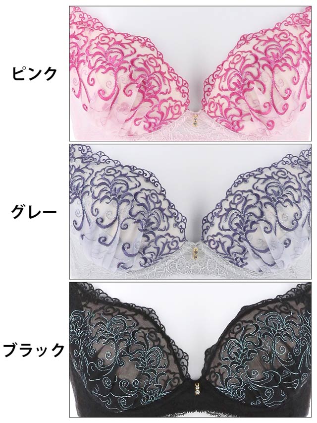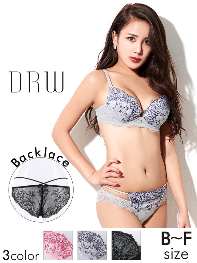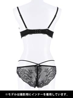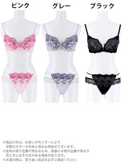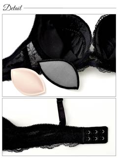 刺繍のブラセット☆カップ裏には、厚めと薄めの2種類のレモンパッドがついてるから、バストの盛りメイクも完璧です♪ショーツのサイドはウエストラインを色っぽく飾るレイヤード風ストリングとバック部分は透け感がSEXYな