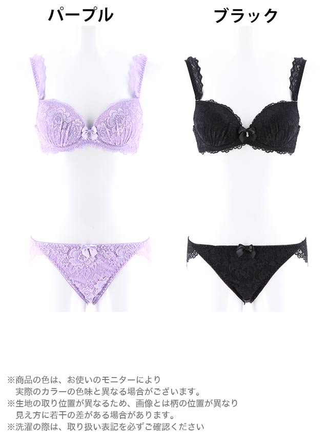 ノンワイヤーブラセット。ブラは厚めの内蔵パッド付き。カップ裏のパネルで胸の横流れを防止し、ノンワイヤーなのに自然なまんまるバストが作れちゃいます!ショーツももちろん総レース仕立てで、レース越しに見える肌が色っぽさ満点!ソフトなつけ心地なのに、綺麗なバストが手に入るノンワイヤーランジェリーはどんなシーンでも大活躍すること間違いなし♪