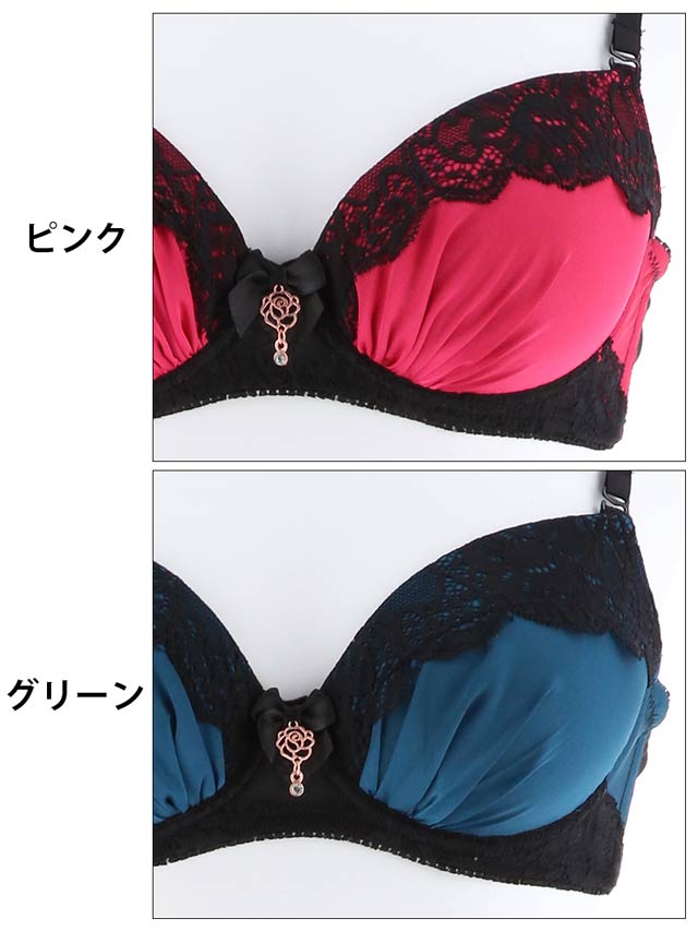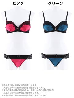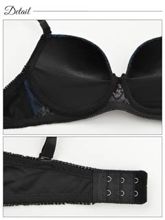 ノンワイヤーブラセット。ブラはカップ裏のパネルが胸の横流れを防止し、ノンワイヤーなのに自然なまんまるバストが作れちゃいます!ショーツは同じ黒レースでサイドを飾った
