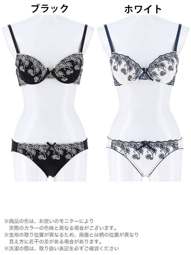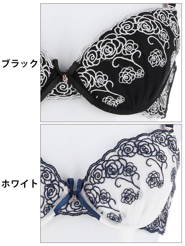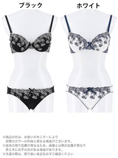 刺繍をチュール地にあしらったモノトーンランジェリー。モノクロームの配色が落ち着いた雰囲気を醸し出します。ブラは、締め付け感の少ない