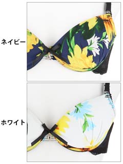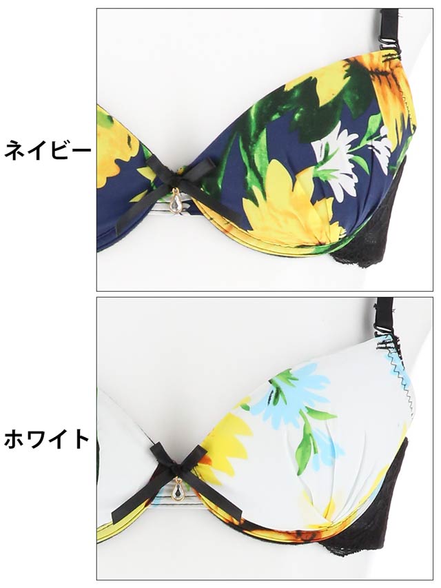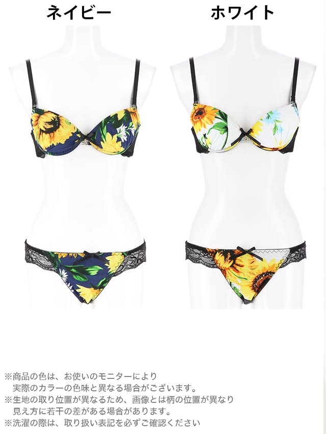 着ているだけで元気になりそうな鮮やかなひまわりがプリントされたブラセット。アンダフリーのカップはブラの締め付けが苦手な人でも、ストレス軽減で着用して頂けます。ショーツにも同じひまわり柄をプリントし、サイドには伸縮性の高いレースを使用。程よく肌透かしてセクシーさをプラス♪