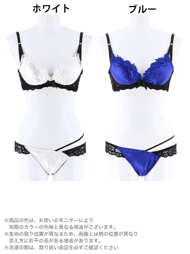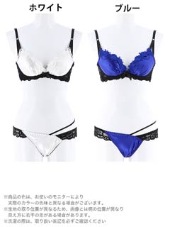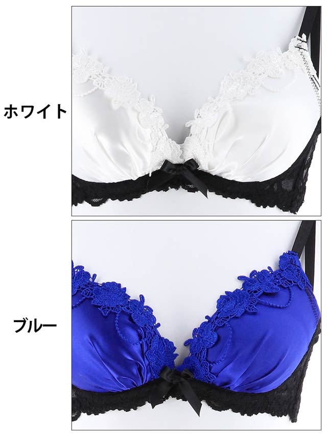 ノンワイヤーランジェリー。艶やかな無地サテンで仕立てたカップ上部に同色のケミカルROSEが咲き誇り、バストをセクシーに演出してくれます。ブラは、脇肉を収めてくれる