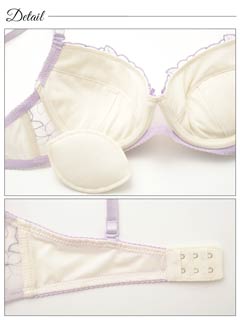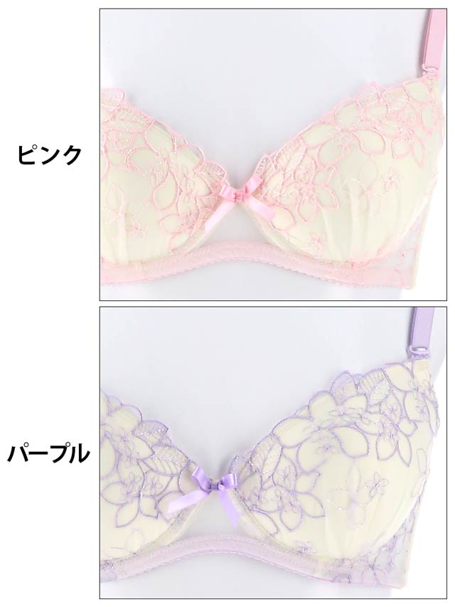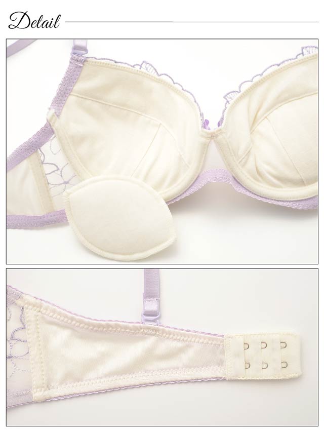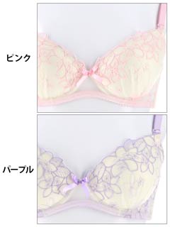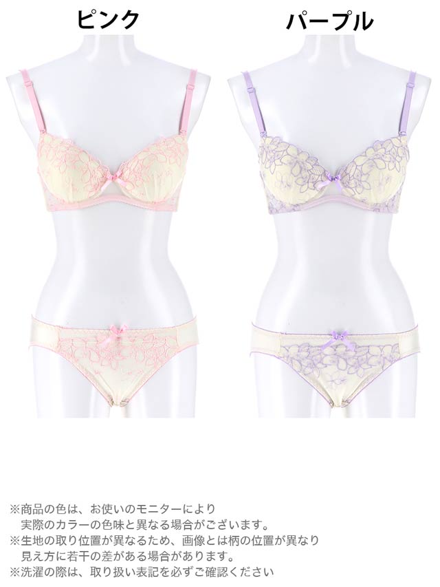 柔らかいクリーム地にパステルの刺繍がキュートなランジェリー♪ガーリーなフラワー刺繍で着ているだけで気分も上がっちゃう!ショーツのフロント部分にも刺繍を施し、全身可愛いブラセットです。