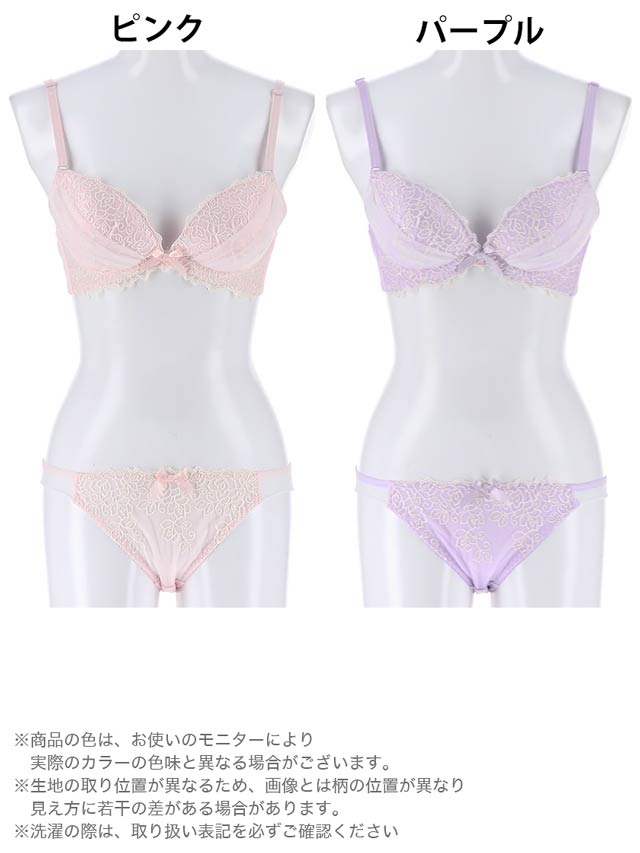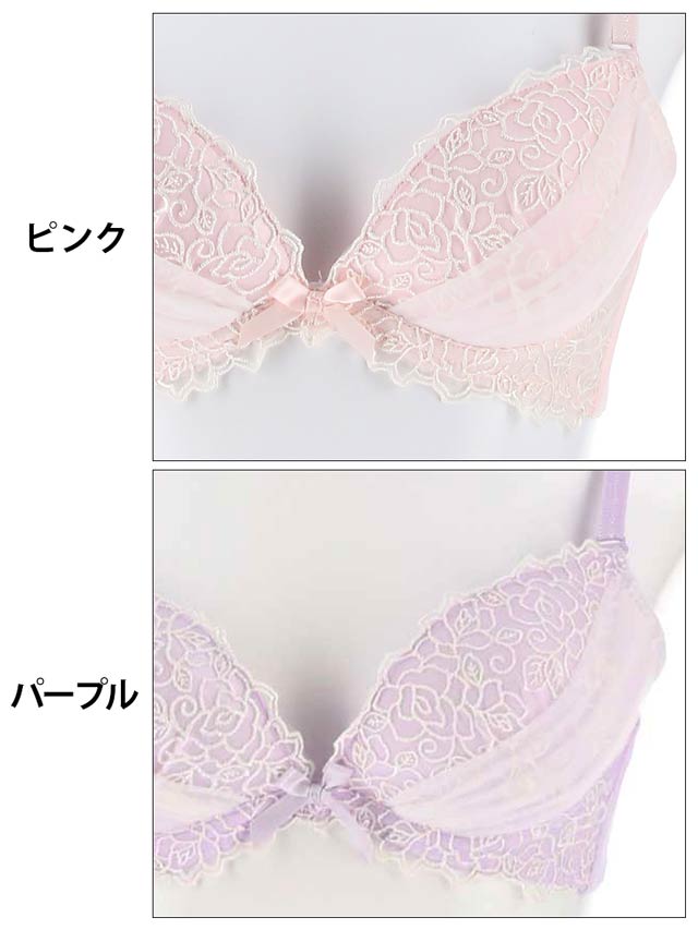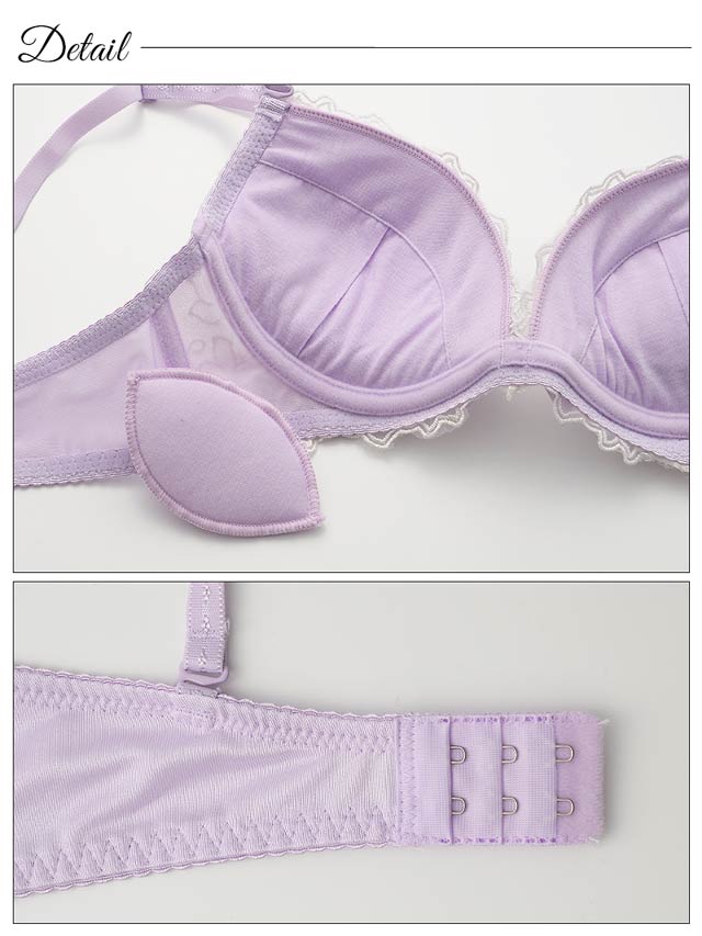 ミルキーなパステル生地に豪華なボタニカル刺繍をあしらったキュートなブラセット。カップ半分はギャザーの寄せたオーガンジーの生地を重ね、ブラのデザインにメリハリを持たせました。着ているだけでメルヘンでキュートな女の子になれるランジェリー♪