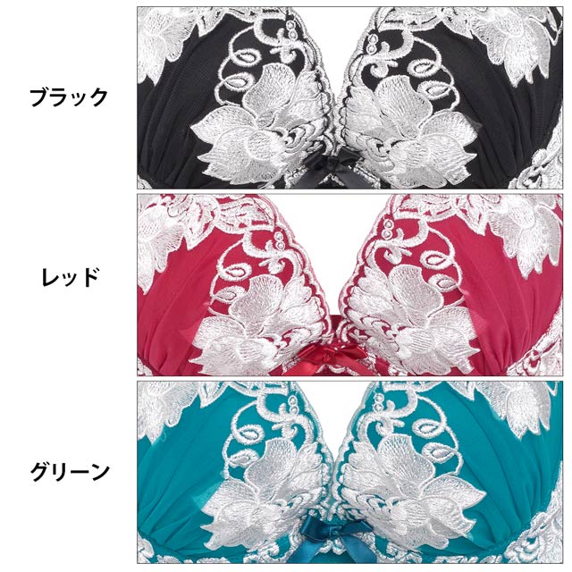 大輪のホワイトフラワー刺繍を贅沢にあしらったブラセット。三角ストラップを左右に調節して脇のお肉を胸にギュッとひき寄せることで、簡単にまんまるバストの完成♪ショーツサイドは1本ラインで腰回りをスッキリ見せ♪カラーで表情が変わる上品なカラー展開だからイロチ買いして、気分で使い分けるのもOK◎